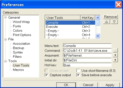 Do kompilowania i uruchamiania programów będziemy potrzebowali środowiska Javy - wirtualnej maszyny Javy (JVM). Można ją ściągnąc ze witryny firmy Sun pod tym adresem. Do duetu potrzebny będzie nam edytor tekstu z funkcją kompilacji i uruchamiania programów. Do tego typu zastosowań świetnie nadaje się Crimson Editor. Stawiałem w nim pierwsze kroki i dziś muszę przyznać, że to naprawdę wygodna i łatwa w obsłudze aplikacja.