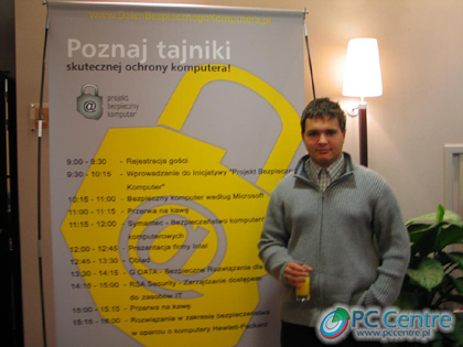 Marek: Konferencję rozpoczęła prelekcja wprowadzająca w tematykę bezpieczeństwa. Prowadzący tę część spotkania przedstawiciel Microsoftu (pan Jarosław Kwiatkiewicz) mówił, jak ważna jest dbałość o bezpieczeństwo zarówno domowego, jak też biurowego komputera. W czasie wykładu podano 7 kroków wpływających na znaczne zmniejszenie podatności komputera na wirusy i ataki z zewnątrz: