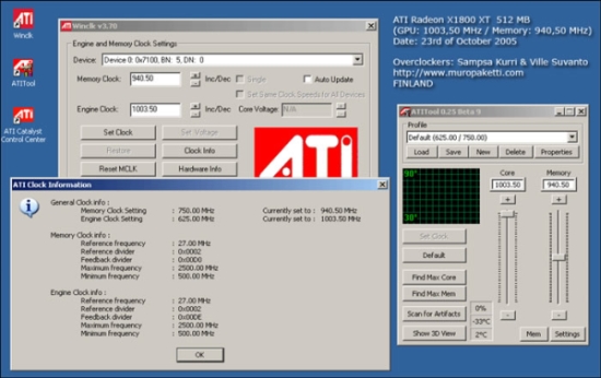 Zespół fińskich overclockerów zdołał podkręcić rdzeń karty graficznej Radeon X1800 XT do niesamowitej częstotliwości 1003 MHz. System przy tak podkręconym układzie graficznym był całkowicie stabilny, na ekranie nie pojawiały się żadne artefakty. Pamięci udało się przetaktować do równie imponującej wartości 1881 MHz. Tak wysokich wyników nie udałoby się uzyskać bez specjalnego chłodzenia. Sampsa Kurri i Ville Suvanto użyli własnoręcznie zbudowanego systemu chłodzącego ciekłym azotem; rdzeń karty „zamrożony” został do temperatury -80 stopni Celsjusza.