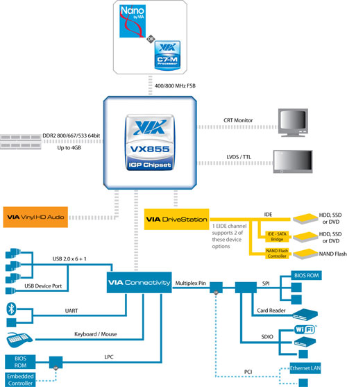 VIA VX855 MSP (Media System Processor) będzie układem obsługującym takie formaty jak H.264, MPEG-2/4, DivX i WMV9. Dzięki niemu ma być możliwe płynne odtwarzanie filmów w wysokich rozdzielczościach (Full HD).