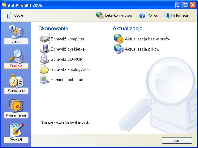 - Funkcje – moduł ten umożliwia rozpoczęcie poszukiwania wirusów w wybranej lokacji oraz zaktualizowanie programu i baz sygnatur