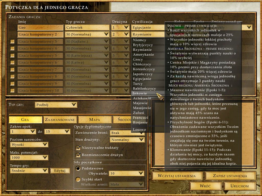 Wśród trybów gry adresowanych dla pojedynczego gracza są także – wspomniane już – potyczki. W istocie są to rozgrywki toczone wedle zasad nakreślonych przez gracza. Przed rozpoczęciem gry można wskazać, ilu graczy ma brać w niej udział (w przypadku komputerowych graczy możemy wskazać, jak trudnym mają być przeciwnikiem/sojusznikiem), jaki ma być rozkład drużyn (sojuszy), jak wielka i jak bogata w surowce ma być mapa, jaki zakres epok ma obejmować rozrywka itp. Krótko mówiąc, gracz może ustalić każdy ważniejszy element gry. Nie zapomniano także o możliwości wczytania mapy wykonanej w dołączonym edytorze.