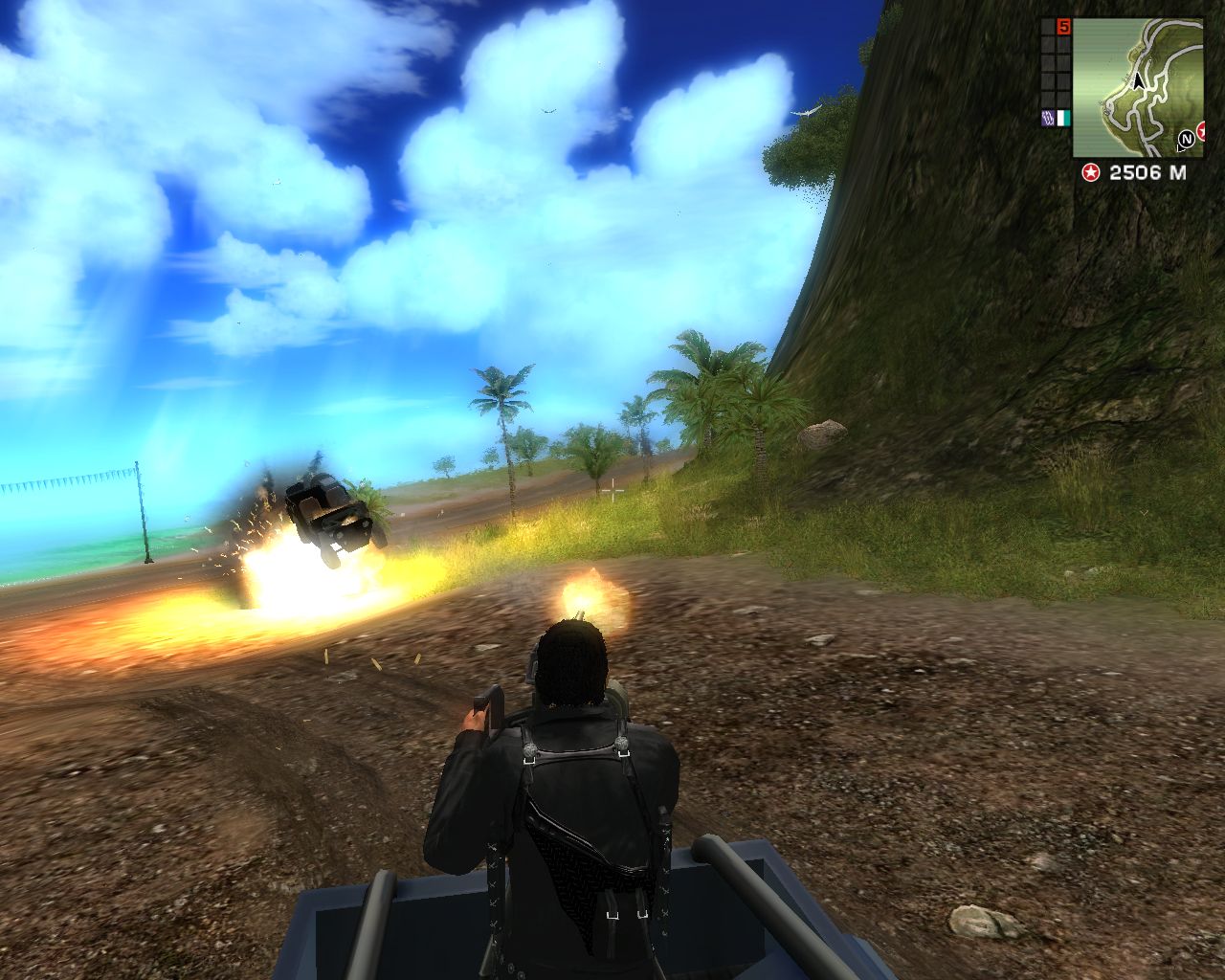 Już na początku gry, tuż po wykonaniu misji inicjacyjnej, możemy zająć się zwiedzaniem San Esperito. A jest co zwiedzać! Powierzchnia świata gry ma ponad 1000 mil kwadratowych (!) zróżnicowanego terenu. Są skąpane w słońcu plaże, gęste lasy tropikalne, duże miasta, małe wioski, rzeki dzielące ogromną wyspę na mniejsze, strome urwiska, wysokie góry. Jest nawet wulkan, chociaż wygasły i przerobiony na ekskluzywny klub. Wszystko to bez dodatkowych pasków ładowania i zacięć spowodowanych dogrywaniem. Całość wygląda bardzo ładnie i chodzi płynnie, nawet na średniej klasy sprzęcie, za sprawą autorskiego silnika Avalanche specjalizującego się właśnie w takich widokach. Na pierwszy rzut oka na myśl przychodzi Far Cry, chociaż w Just Cause poszycie leśne nie jest tak urozmaicone. Kolejną mocną stroną grafiki produktu są efekty specjalne. Wybuchy prezentują się bardzo ładnie, a wrażenie potęguje wstrząs kamery proporcjonalny do siły eksplozji, jaką odczuwa bohater.