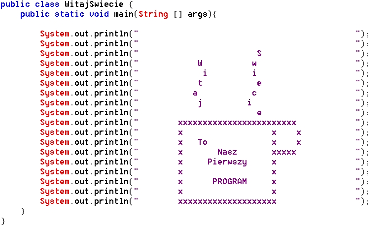 Póki co nie ma większego sensu zaglębiać się laikowi w znaczenie tego kodu. Zapamiętajmy lepiej to: nasz program nazywa się WitajSwiecie i dlatego powinien on być zapisany w pliku WitajSwiecie.java (zwracajcie uwagę na małe i duże litery!).