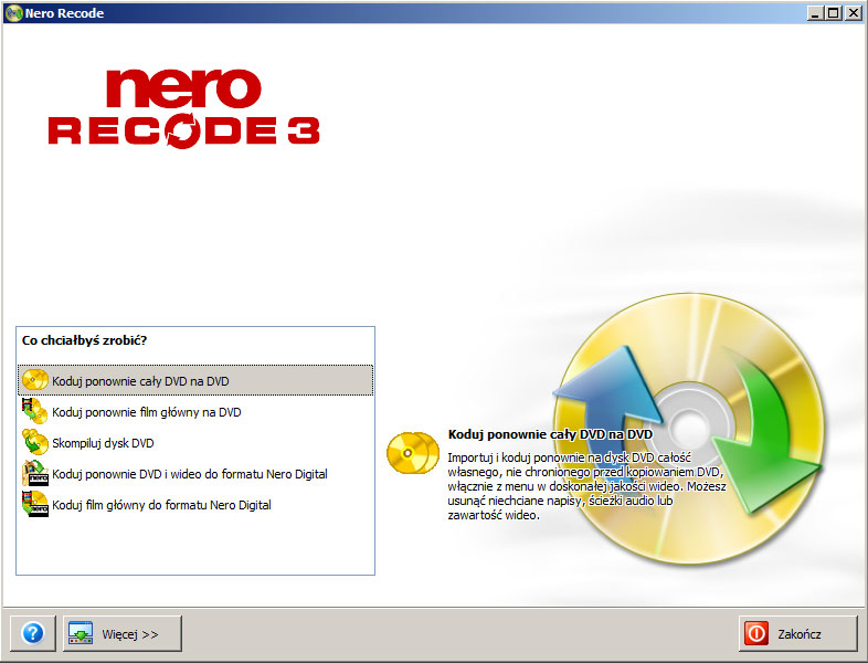 Wśród programów do nagrywania multimediów wymienić należy Nero Recode 3. Aplikacja służy do wykonywania kopii zapasowych filmów DVD (o ile nie są chronione przed kopiowaniem). Pozwala m.in. na usunięcie niechcianej zawartości (np. jednej ze ścieżek dźwiękowych) i dogranie dodatkowych filmów wideo. Jego obsługę można uznać za przyjemną.