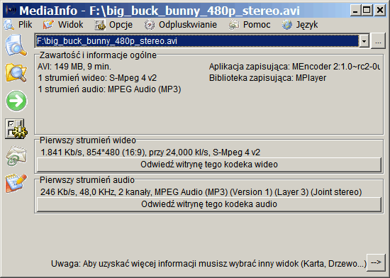 Media Info to program, który pomoże nam w wydobyciu informacji o plikach multimedialnych ze znaczników. Wśród informacji możliwych do zdobycia są: tytuł, autor, reżyser, album, czas trwania, data, numer nagrania, proporcje obrazu, użyte kodeki, ilość bitów i klatek na sekundę, język, liczba kanałów, częstotliwość próbkowania. Wspiera formaty: MKV, OGM, AVI, DivX, WMV, QuickTime, Real, MPEG-1, MPEG-2, MPEG-4, DVD (VOB), ..., audio: OGG, MP3, WAV, RA, AC3, DTS, AAC, M4A, AU, AIFF, czy napisów: SRT, SSA, ASS, SAMI. Istnieje możliwość dopasowania sposobu wyświetlania napisów do naszych preferencji (posiać tekstu, karty, drzewka, HTML) oraz eksportowania wyników do pliku. Media Info jest dostępny w polskiej wersji językowej na licencji GPL.