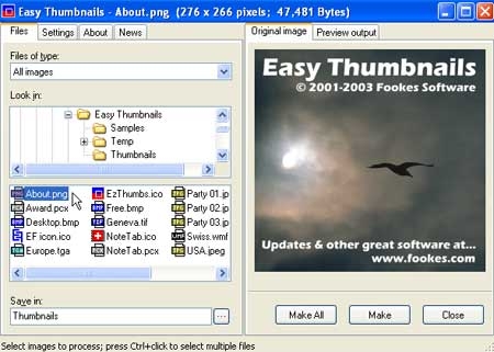 Easy Thumbnails jest to prosta w obsłudze aplikacja wykazująca funkcjonalność w zakresie seryjnego tworzenia miniatur obrazków. Dzięki niej możemy określić jakość skalowanych obrazków, parametry dotyczące ich wielkości oraz zmiany jasności i kontrastu. Narzędzie pozwala nam także na nadawanie nazw wg. określonego klucza. Program obsługuje najpopularniejsze formaty plików graficznych.