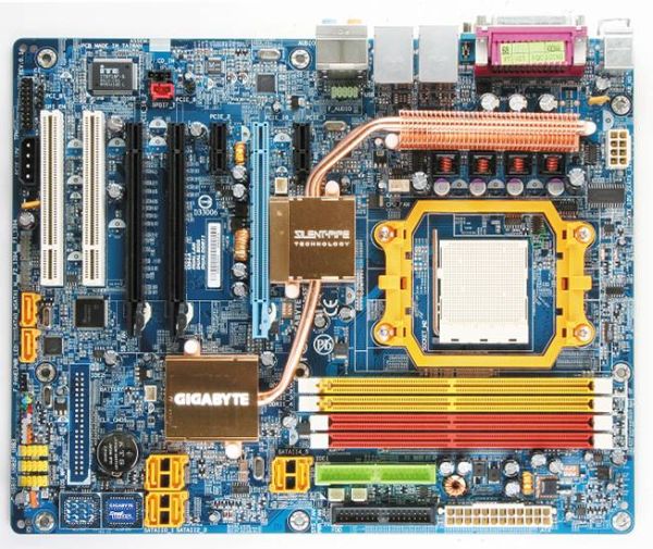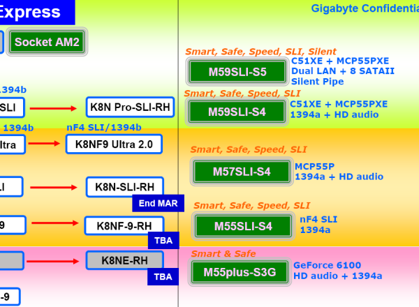 Gigabyte, kolejny po Asusie producent, szykuje swoją ofertę dotyczącą płyt głównych obsługujących nadchodzące procesory AM2. Początkowo w sprzedaży pojawi się pięć modeli oznaczonych literą S poprzedzoną cyfrą, która zdradzać będzie stopień wyposażenia i wydajności płyty - topowe modele ochrzczone są piątką, modele tańsze posiadają w nazwie czwórkę itd. Tak jak w przypadku topowej płyty Asusa, tak i topowa płyta główna Gigabyte oparta jest na chipsecie nForce 590 SLI. Model M59SLI-S5 posiada dwa sloty PCIe x16, dwa porty eSATA, podwójny BIOS, 8 złączy SATA 3.0 i obsługuje 10 portów USB. Spośród konkurencji wyróżniać się będzie zastosowanym układem dźwiękowym RealTek ALC888DD będącym ulepszoną wersją procesora ALC883, który posiada wsparcie dla telefonii internetowej i wideokonferencji. Płyta spełnia rygorystyczne wymagania certyfikatu Nvidia Tritium.