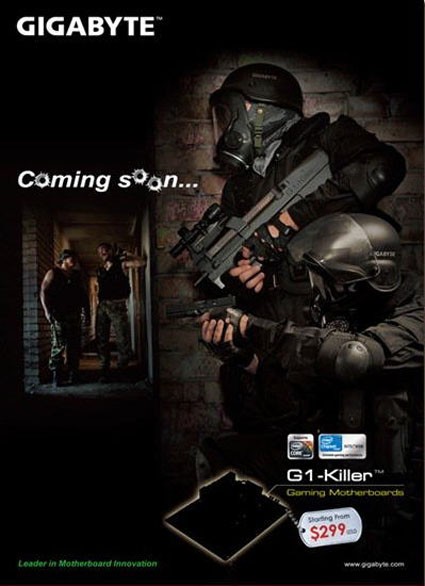 Szczegóły na temat nowej płyty nie są znane, ale poniższe zdjęcie wyraźnie pokazuje, że będzie ona obsługiwać procesory Intela z podstawką LGA 1366 (logo Extreme Edition). Poza tym z plakatu możemy się także dowiedzieć, że konkurent Asus ROG będzie kosztował niecałe 300 dolarów, a jego nazwa to G1-Killer. Brzmi naprawdę groźnie.