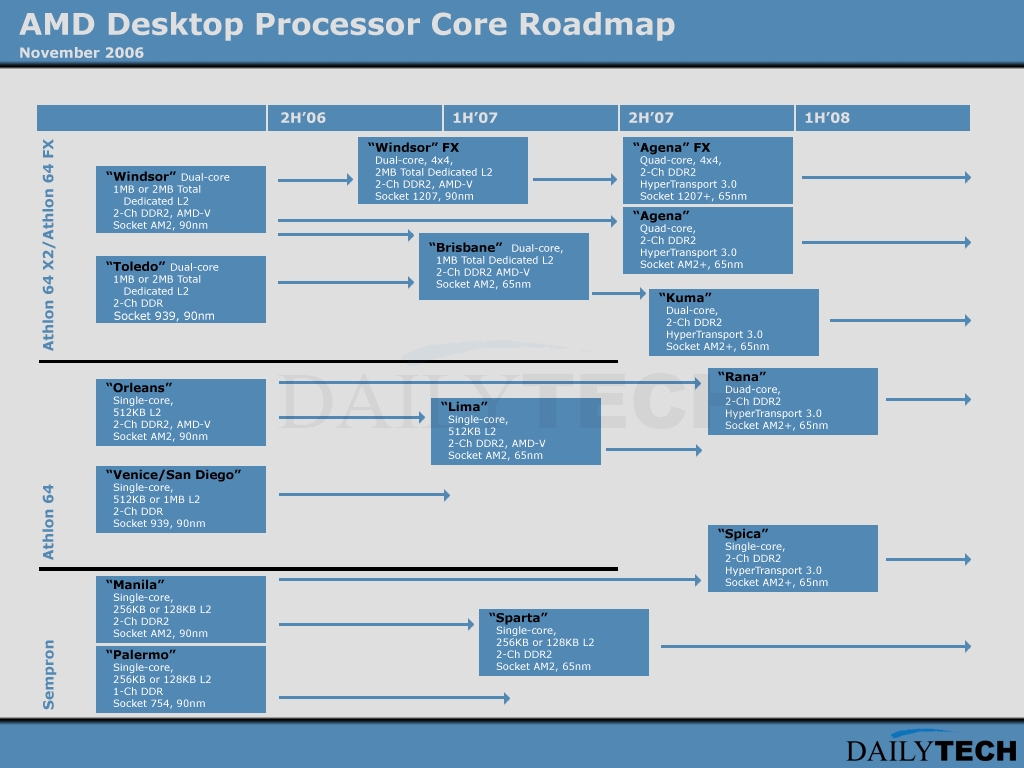 Pierwsze układy na AM2+ pojawią się w trzecim kwartale przyszłego roku. Agena i Agena FX to procesory czterordzeniowe. Procesor Agena FX będzie podstawą platformy 4x4 i dostępny będzie tylko w wersji na podstawkę z 1207 pinami.