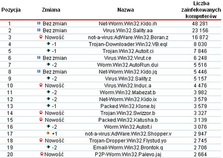 Na pierwszym miejscu wśród najpopularniejszych szkodliwych programów znalezionych na komputerach użytkowników w sierpniu uplasował się Net-Worm.Win32.Kido.ih (48 281 infekcji). Na drugim - Virus.Win32.Sality.aa, który zainfekował ponad dwukrotnie mniej komputerów (23 156). Z kolei na trzecim miejscu znalazł się not-a-virus:AdWare.Win32.Boran.z (16 872).