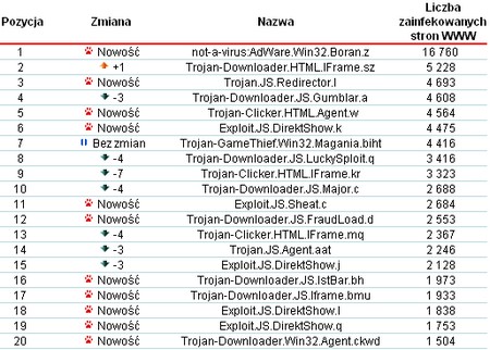 Szkodnikiem, który był najczęściej znajdywany na stronach internetowych w sierpniu okazał się not-a-virus:AdWare.Win32.Boran.z, który zainfekował 16760 witryn. Kolejne miejsca zajęły między innymi: Trojan-Downloader.HTML.IFrame.sz oraz Trojan.JS.Redirector.l .