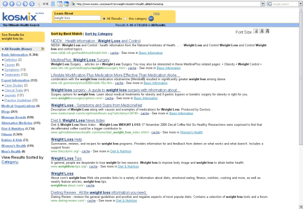 Silnik Kosmix obiecuje, że wyniki wyszukiwania będą trafniejsze, dzięki analizie zawartości strony, a nie tylko popularności jej adresu URL w Internecie. Rezultaty katalogowane są podobnie jak na witrynie Yahoo. Póki co na stronie Kosmix znajduje się silnik wyszukujący strony związane ze zdrowiem, twórcy zapowiadają jednak, że w przeciągu kolejnych miesięcy pojawiać się będą coraz to nowsze kategorie.