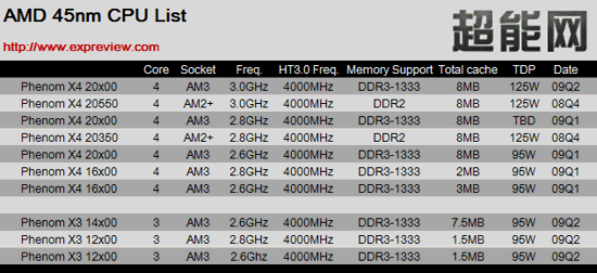 Nowe procesory 45-nanometrowe z serii Phenom X4:20550 i 20350 będą taktowane z częstotliwością 3GHz i 2.8 GHz. Oba będą dostępne na platformę dla płyt głównych z podstawką AM2+ i będą miały wbudowany kontroler pamięci DDR2. W sklepach zobaczymy je najprawdopodobniej pod koniec roku, jednak ich obecność na rynku nie potrwa zbyt długo. Zamówienia będą realizowane tylko do drugiego kwartału przyszłego roku.