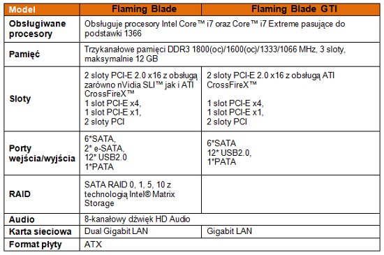 Płyty główne Foxconn Flaming Blade oraz Flaming Blade GTI są oparte o chipset Intel X58, co pozwala im na obsługę najnowszych procesorów Intel Core i7 (podstawka LGA1366) oraz pamięci DDR3. Producent informuje, że płyty Flaming Blade potrafią uwolnić pełną moc najnowszych czterordzeniowych procesorów i osiągają olbrzymią wydajność w aplikacjach wielowątkowych. Dzięki zastosowaniu technologii Intel Turbo Boost aplikacje jednowątkowe również zyskują na prędkości działania, ponieważ procesor automatycznie podnosi częstotliwość pracy, jeśli chociaż jeden z rdzeni nie jest używany.