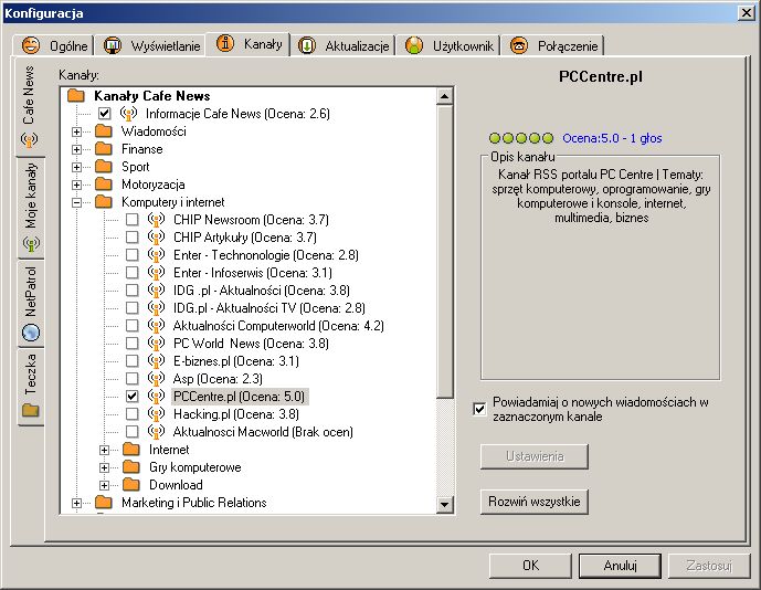 Program można pobrać w dziale Download oraz na stronie www.cafenews.pl. Aby zasubskrybować aktualności z PC Centre, należy uruchomić Cafe News, kliknąć Nowy kanał, a następnie zaznaczyć pozycję PCCentre.pl, która znajduje się w gałęzi Komputery i internet.