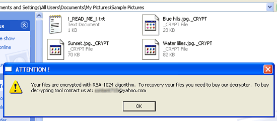 Gpcode dodaje do zaszyfrowanych przez siebie plików rozszerzenie ._CRYPT i umieszcza plik !_READ_ME_!.txt w każdym folderze zawierającym zaszyfrowane obiekty. W pliku tekstowym można przeczytać następującą wiadomość: Your files are encrypted with RSA-1024 algorithm. To recovery your files you need to buy our decryptor. To buy decrypting tool contact us at: *****@yahoo.com (Twój plik został zaszyfrowany przy użyciu 1024-bitowego algorytmu RSA. W celu odzyskania swoich plików musisz kupić nasz program deszyfrujący. W celu dokonania zakupu skontaktuj się z nami pod adresem: *****@yahoo.com).