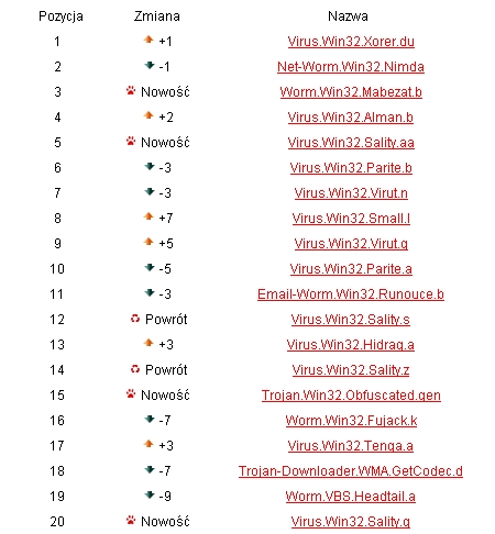 Tutaj na pierwszym miejscu znalazł się Virus.Win32.Xorer.du. Pojawiły się tylko cztery nowości (o ~56 proc. mniej, niż w rankingu najbardziej rozpowszechnionych szkodliwych programów). Wg KSN, liczba programów infekujących pliki znacznie zmniejszyła się w ciągu ostatnich trzech miesięcy.