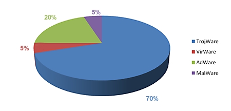 Poniższy wykres przedstawia popularność poszczególnych typów złośliwego oprogramowania.