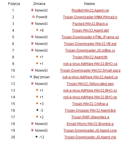 Najbardziej rozpowszechnionym wirusem został Rootkit.Win32.Agent.cvx. Kaspersky Lab wykrył go 28 sierpnia. Trudnymi programami do znalezienia są rootkity, które ukrywają dostęp innych wirusów w naszym komputerze. Jak widać, rynek wirusów rozwija się bardzo gwałtownie, pojawiło się aż 9 nowych szkodników. Wymusza to na producentach programów antywirusowych bardziej restrykcyjne rozwiązania.