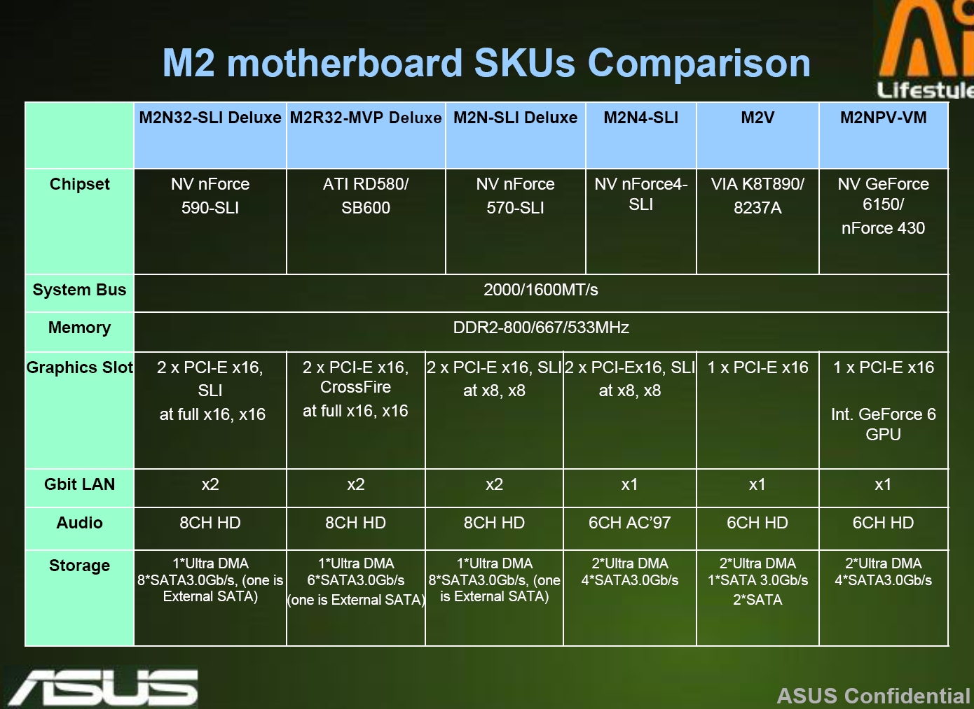 Model M2N4-SLI oparty jest na starszym chipsecie nForce 4 SLI. Od swoich droższych braci różni się on słabszym układem dźwiękowym AC’97. Reszta specyfikacji jest bardzo podobna. ASUS M2V to jedyna płyta oparta na chipsecie firmy VIA. Układ K7T890 obsługuje tylko jedno złącze PCIe x16 i jeden port SATA 3.0. Najtańszą płytą główną obsługującą procesory AM2 będzie model M2NPV-VM oparty na chipsecie nForce 430 ze zintegrowanym układem graficznym GeForce 6150.