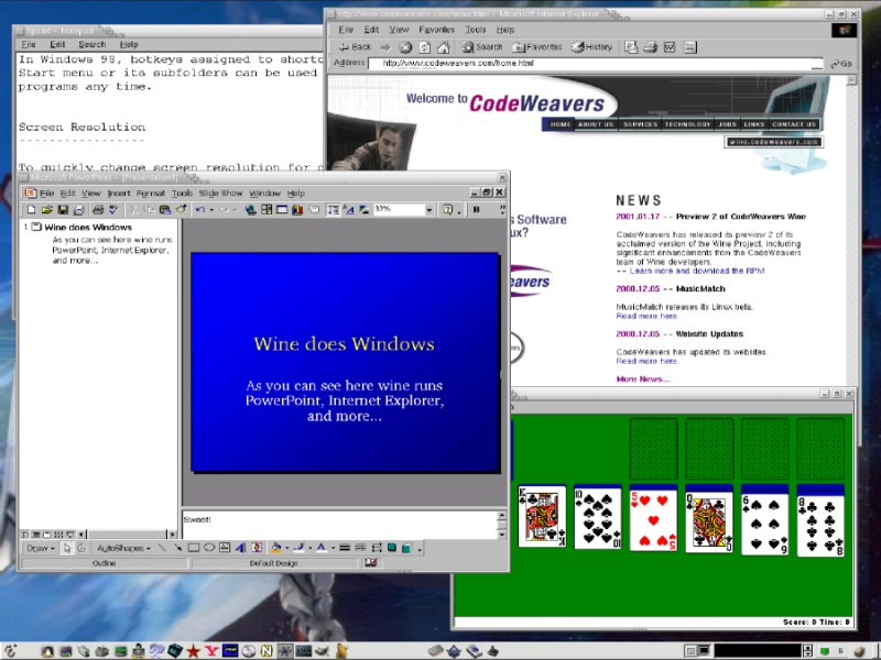 Wine pozwala na uruchomienie windowsowego programu w Linuksie, co oznacza, że wraz z jego ukazaniem kończą się problemy z niezgodnością oprogramowania, ale nie w każdym przypadku. Im nowszy program, tym większe kłopoty może sprawiać, niemniej trzeba podkreślić, że lista supportowanych aplikacji jest naprawdę długa i imponująca (na niej m.in. Photoshop CS2, Half-Life 2 Retail, Baldur’s Gate 2: Throne of Bhaal, World of Warcraft 2.4.x, Battlefield 2.1.x – pełna lista dostępna jest pod adresem: http://appdb.winehq.org/).