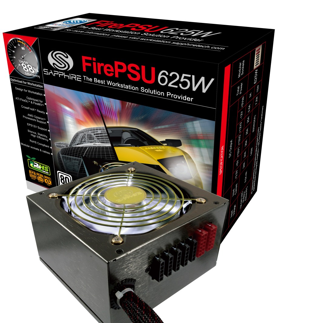 Firma Sapphire wprowadziła do sprzedaży zaprezentowany na targach CeBIT 2009 zasilacz FirePSU o mocy 625 W, wydajności dochodzącej do 88 proc. oraz możliwości odpięcia nieużywanych kabli.