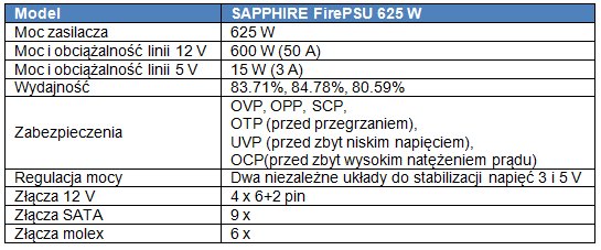 FirePSU 625 W posiada trzy zestawy złącz 6+2 pin o łącznej mocy 500 W i obciążalności 50 A, co ma pozwolić na bezproblemowe zasilanie do trzech kart graficznych jednocześnie. Obecne są również złącza DC 3,3 V i 5 V o łącznej mocy 140 W. Producent zapewnia, że rzeczywista moc zasilacza wynosi 625 W. Zastosowany układ Active PFC poprawia współczynnik mocy, który w przypadku Sapphire FirePSU wynosi 0,99.