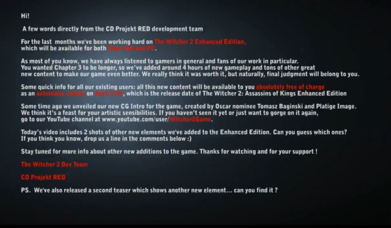 Wczoraj do sieci trafił pierwszy zwiastun Edycji Rozszerzonej Wiedźmina 2. Najciekawsza jest w nim końcówka, ponieważ dosłownie przez ułamek sekundy widoczna jest wiadomość od twórców, w której informują, że zdecydowali się na przedłużenie rozgrywki. Dotyczy to trzeciego rozdziału gry, który ma być dłuższy o ponad 4 godziny. To bardzo dużo zważywszy na fakt, że coraz więcej tytułów można w takim samym czasie przejść niemalże w całości. Podobno nowe elementy są widoczne na zwiastunie, a CD Projekt RED zachęca do ich poszukiwania.