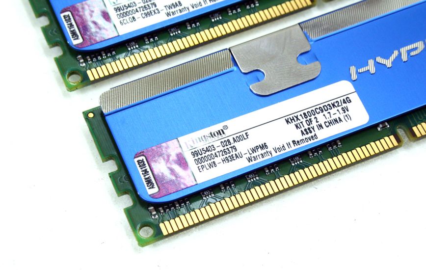 Kingston HyperX 1800 CL9 2x2 GB to pamięci stworzone dla entuzjastów sprzętu komputerowego i Overclockerów. Kości zasłaniają aluminiowe radiatory dobrze radzące sobie z odprowadzaniem nagromadzonego ciepła. Pamięci Kingstona słabo radzą sobie z opóźnieniami CL6 i CL7, a więc nie nadają się zbytnio do platformy AM3. Choć producent podaję zalecane napięcie z przedziału 1,7 - 1,9 V to pamięci dobrze radzą sobie już przy napięciu 1,65 V. Maksymalne stabilne taktowanie jakie udało się osiągnąć pamięciom Kingstona przy timingach 9-10-9-28 i napięciu 1,75 V wyniosło 1064 MHz (2128 MHz efektywnie). Pamięci ze względu na swoją specyfikę przeznaczone są dla platformy Intel P55. Kompatybilność układów z najróżniejszymi płytami głównymi stoi na najwyższym poziomie. Cena zestawu oscyluje w granicach 480 zł. Producent objął Kingstony HyperX 1800 CL9 2x2 GB dożywotnią gwarancją.