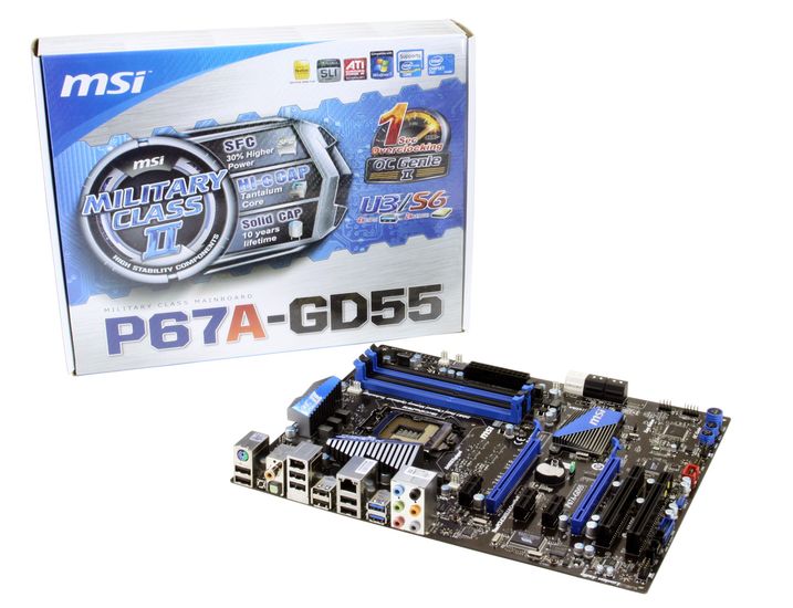 MSI P67A-GD55 to płyta główna kierowana do użytkowników o średnio zasobnym portfelu. Konstrukcja została oparta o najnowszy chipset Intela - P67 (Cougar Point) i dedykowana jest wszystkim procesorom na socket LGA1155 (seria Core iX 2000). Płyta została wyposażona w podzespoły najwyższej jakość (tzw. klasa militarna), a także w technologię OC Genie, dzięki której w prosty sposób możemy zwiększyć wydajność naszych podzespołów klikając tylko jeden przycisk. Producent wyposażył płytę w prosty intuicyjny BIOS oparty na UEFI. Cena płyty oscyluje w okolicach 550-570 zł. Produkt został objęty 36-miesięczną gwarancją producenta.