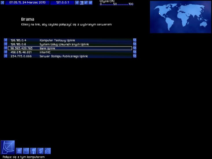 Uplink to dzieło angielskiego zespołu Introversion Software. Pozwala graczom na przeistoczenie się ze zwykłego użytkownika komputerów w tajnego agenta/hackera pracującego dla dużych, międzynarodowych korporacji. Naszym chlebem powszednim stanie się łamanie zabezpieczeń konkurencyjnych firm, włamywanie się do ich systemów, wykradanie tajemnic przemysłowych, sabotowanie pracy, a nawet szantażowanie i straszenie ich pracowników. Za każde dobrze wykonane zlecenie dostajemy określoną ilość pieniędzy, które możemy przeznaczyć na rozbudowę swojego sprzętu komputerowego i zakup nowego oprogramowania. Każdy nowy gadżet zwiększa naszą skuteczność, a to wydatnie podnosi naszą reputację w branży i tym samym cenę usług.Główną zaletą Uplink jest poziom realizmu. Autorzy gry twierdzą, że nie znajdziemy tu nic totalnie nierealistycznego. Cała rozgrywka bazuje na rzeczywistym hackowaniu, jednak na potrzeby zwykłych graczy wszystko zostało odpowiednio uproszczone. Na dobrą sprawę możemy się włamać wszędzie i modyfikować wszystko, między innymi: ingerować w transfery bankowe, modyfikować akta i dane ludzi w komputerach policyjnych, a nawet możemy sami tworzyć groźne wirusy.