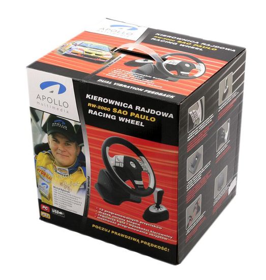 Kierownica Apollo RW-2060 współpracuje zarówno z konsolą Playstation 2, jak i PC.