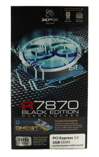 XFX Radeon HD 7870 Double Dissipation BE to karta graficzna znanego producenta sprzętu komputerowego oparta o najnowszy układ firmy AMD o nazwie kodowej Pitcairn XT. Jest to konstrukcja niereferencyjna, producent wyposażył ją w duży cooler wyposażony w rurki cieplne oraz dwa 80-mm wentylatory. Karta pracuje z fabrycznie zwiększonymi zegarami, jej taktowanie wynosi odpowiednio 1050 MHz dla rdzenia graficznago oraz 1250 MHz dla pamięci VRAM. Karta posiada bardzo dobry potencjał OC oraz odznacza się dość dobrą kulturą pracy. Producent objął produkt 24-miesięcznym okresem gwarancyjnym. Cena karty wynosi obecnie około 1400 zł.